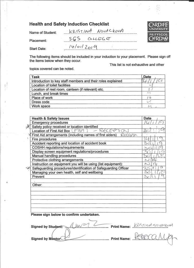 Health and Safety form completed in 2 stages, on the 1st day of my work placement I was introduced to the staff and the building and 2 weeks later I was explained the rest of the procedures and was shown where to find further information when needed. My mentor reassured me to be available if any questions needed to be answered or situations resolved immediatelly.